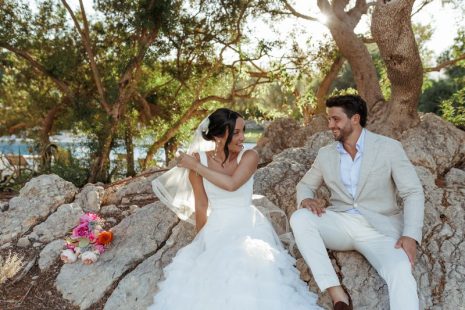 We took them on a lovely venue hunt and visited many special places. We applauded Abbie and Matt’s final venue choice: a gorgeous, recently refurbished Mallorcan finca with 12 top double rooms and no neighbours. The couple moved into the finca hotel and invited everyone to a Welcome party BBQ at a beach club near the venue. The all-white atmosphere and strikingly blue sea provided a great setting for the first event.